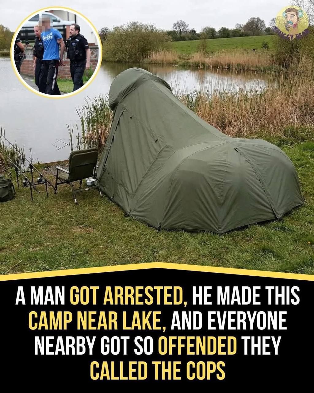 According to reports shared alongside the image, a man was arrested after setting up this camp near the lake. The shelter itself wasn’t illegal in nature—it resembled a common fishing bivvy, the type anglers use for long sessions by the water. These are designed to block wind and rain while blending into the environment. To an experienced fisherman, it looks completely normal.
