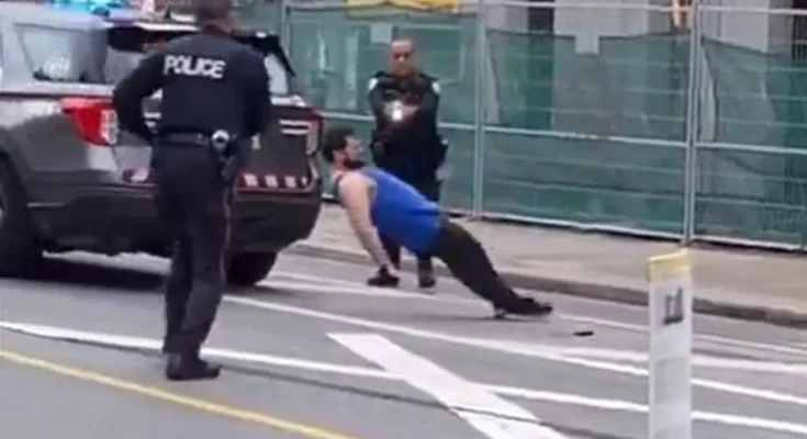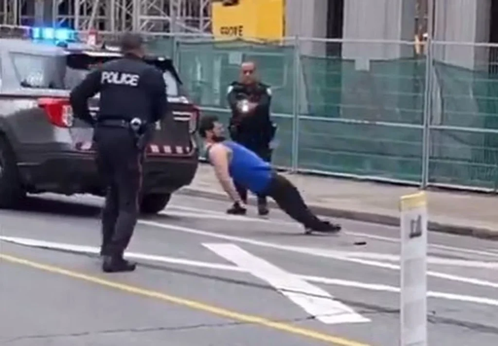 The post, shared on X by user @l3v1at4an, shows a bearded man dressed in a blue tank top and black pants holding a knife in each hand as he is surrounded by two Toronto Police officers.